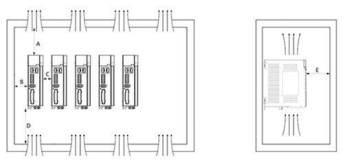 并排安裝時,橫向兩側建議各留 30mm 以上間距V1規(guī)格,無風扇結構,采用側面散熱片進行散熱,因此必須留有30mm的間隙)。首尾兩臺驅動器與柜體側面之間,至少留有 50mm 間隙。